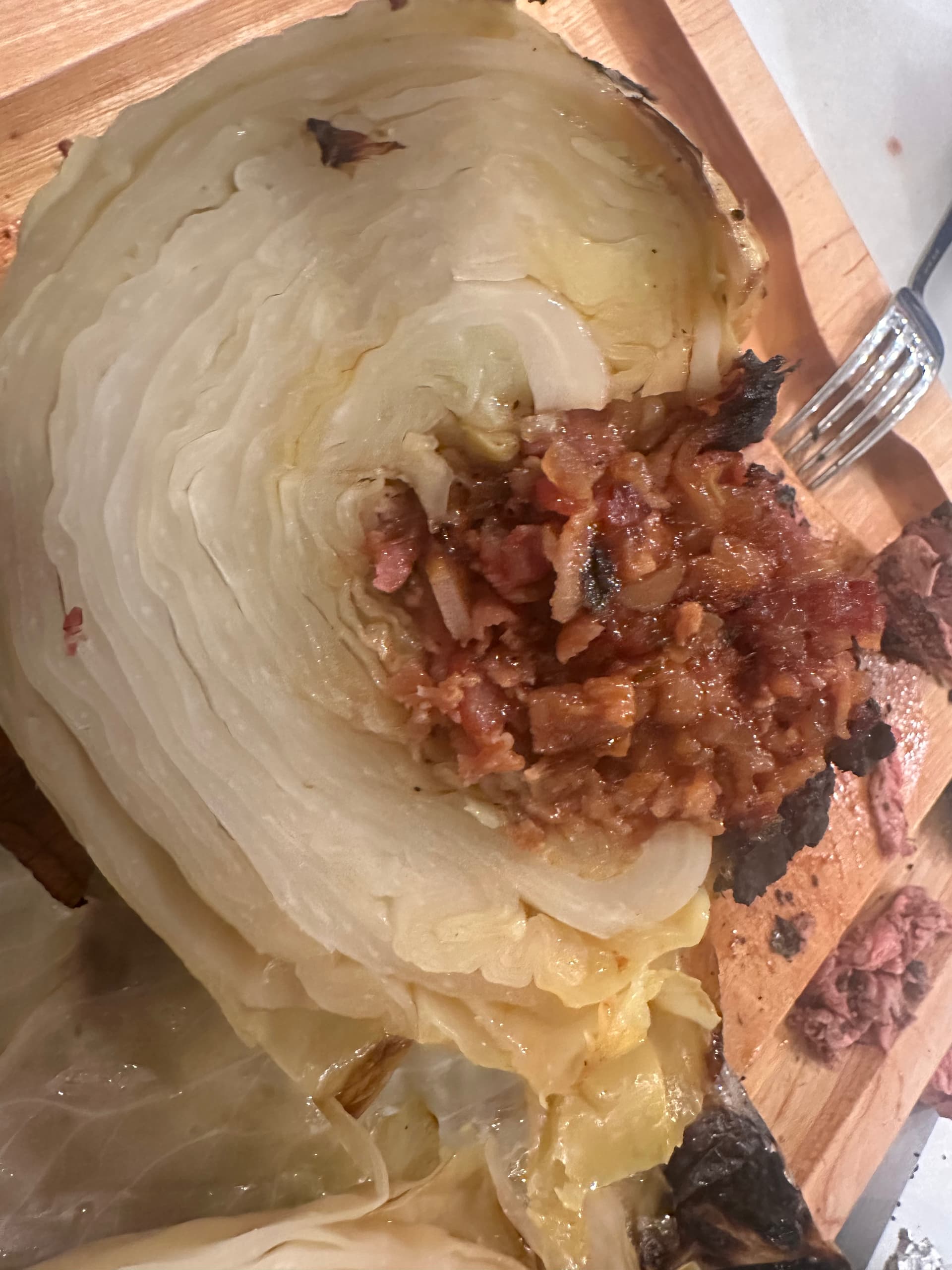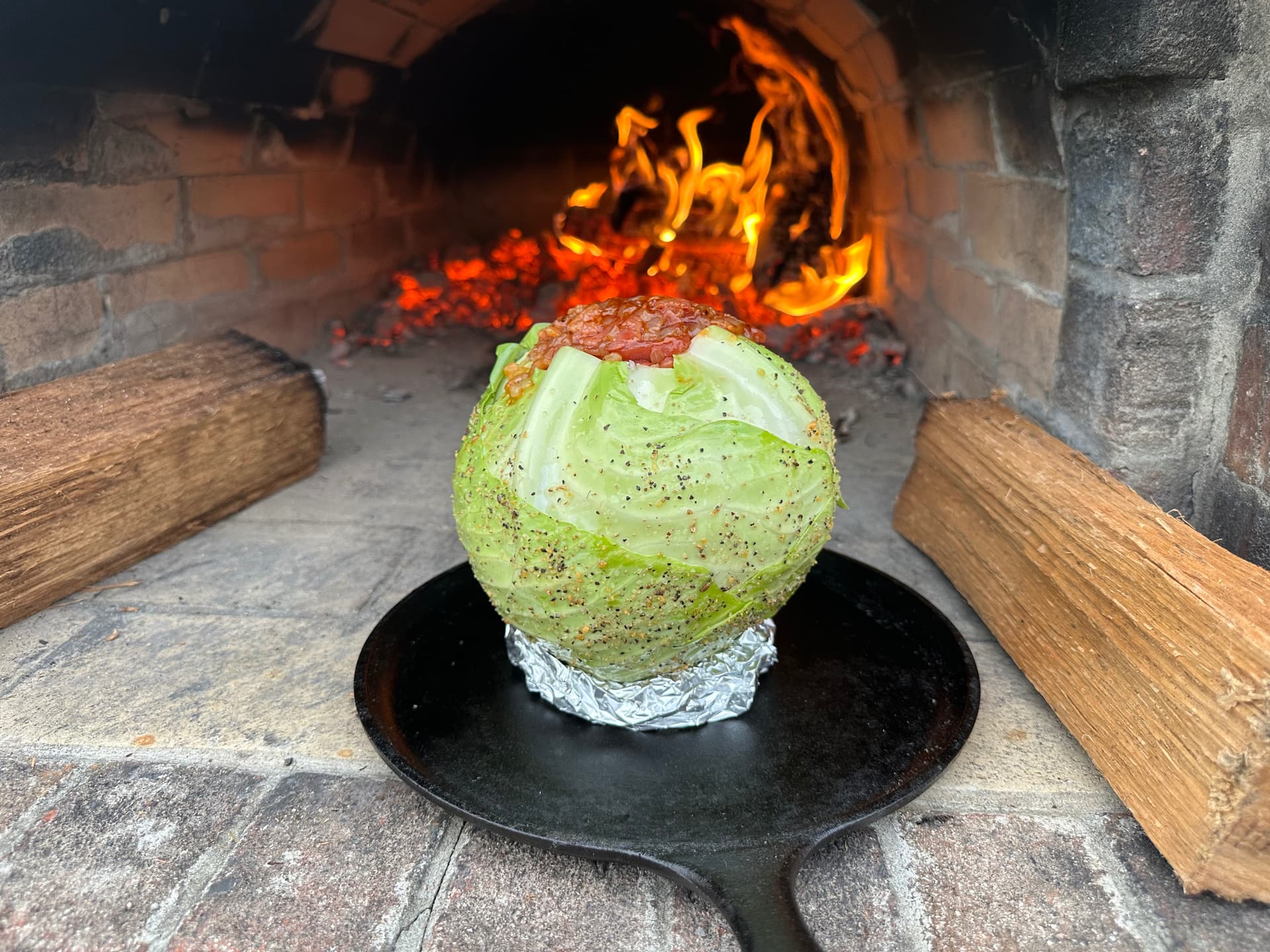 I know it sounds so unconventional but we love bbq’d cabbage. Stuff the cabbage with sautéed bacon, onion, and bbq sauce and then wrap it and turn frequently. Sure, it takes a while but it is so delicious. We had some potatoes and steak to go with it.