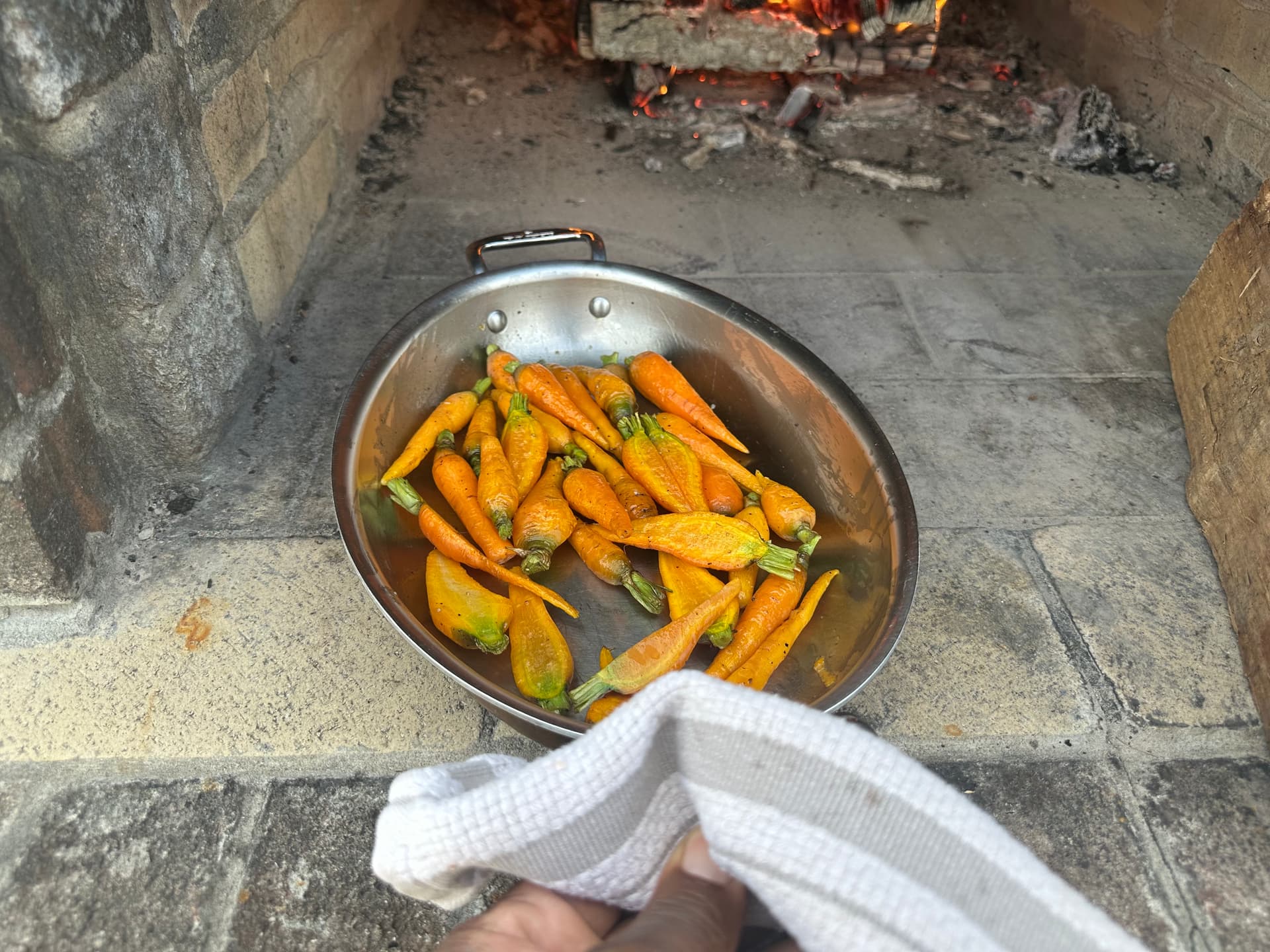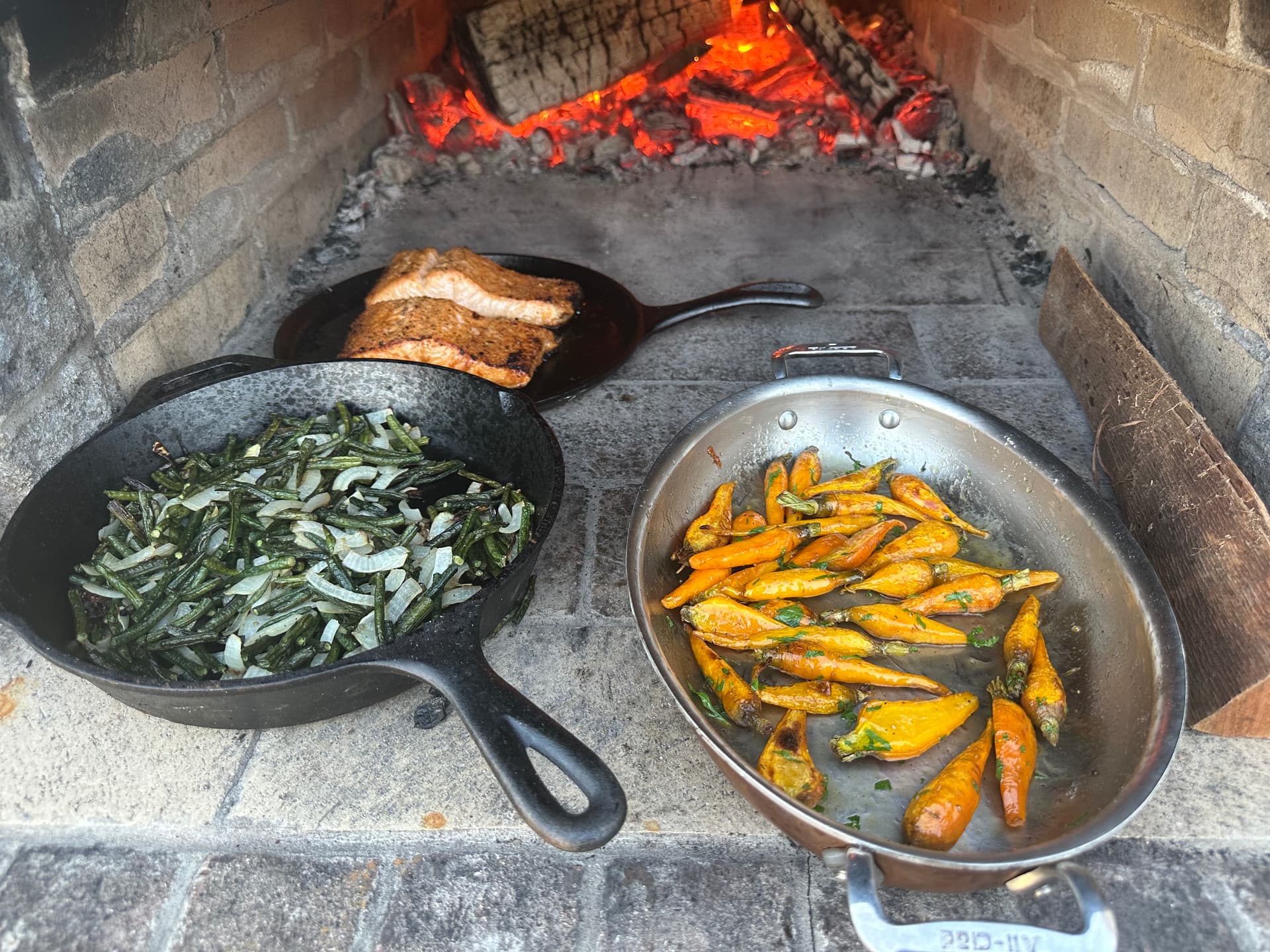 So I’ve watched all of Clive’s videos on YouTube and I’ve been playing with smaller fires for simpler cooks and weeknight dinners. Tonight, I did a smaller fire and started cooking the carrots during the heating phase of the oven. The menu for tonight was honey-sriracha glazed carrots (the carrots were from my garden and the honey from hives belonging good friends and neighbors who live about 12 houses away in the middle of the burbs…), Asian long beans (from my garden) and onions, and salmon. I started the carrots during the firing phase of the oven and the beans cooked while I did the salmon in a couple of batches. I moved the carrots to the opening to keep them warm while everything else was cooking. I love the crisp, salty exterior of the salmon and the juices that get locked in. My favorite way to cook it!