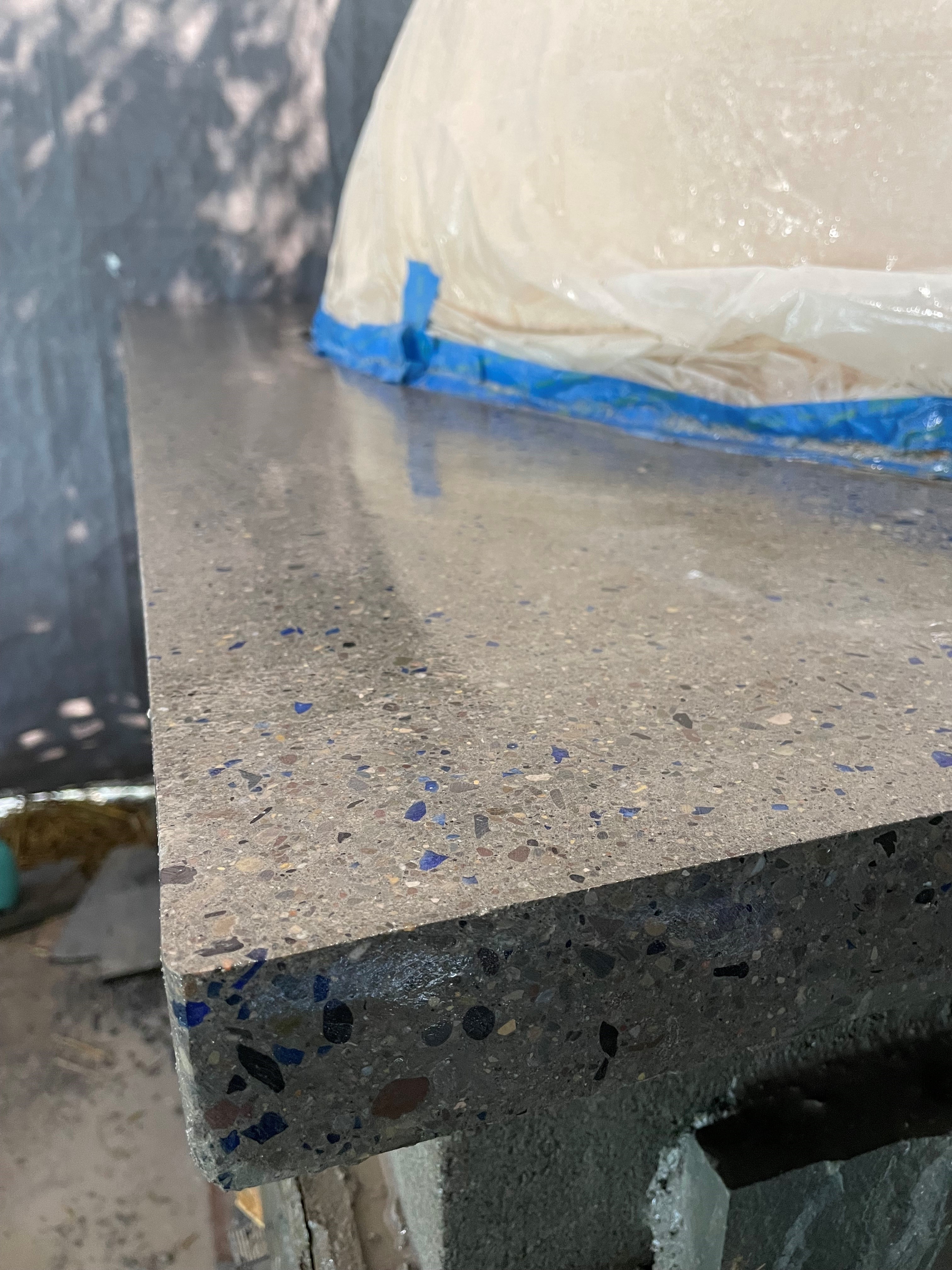 I poured the one around the pizza oven in place (because its rounded) and made the box one in a form- mostly to experiment with the two methods because I had never done it before. They both came out essentially the same (I think I did a better job distributing the glass on the poured in place one because its slightly easier to see what you are doing). If you pour in place the lesson I learned is to polish it before you put the veneer on or else wrap it well, because the ground concrete wants to run all over your finish work…