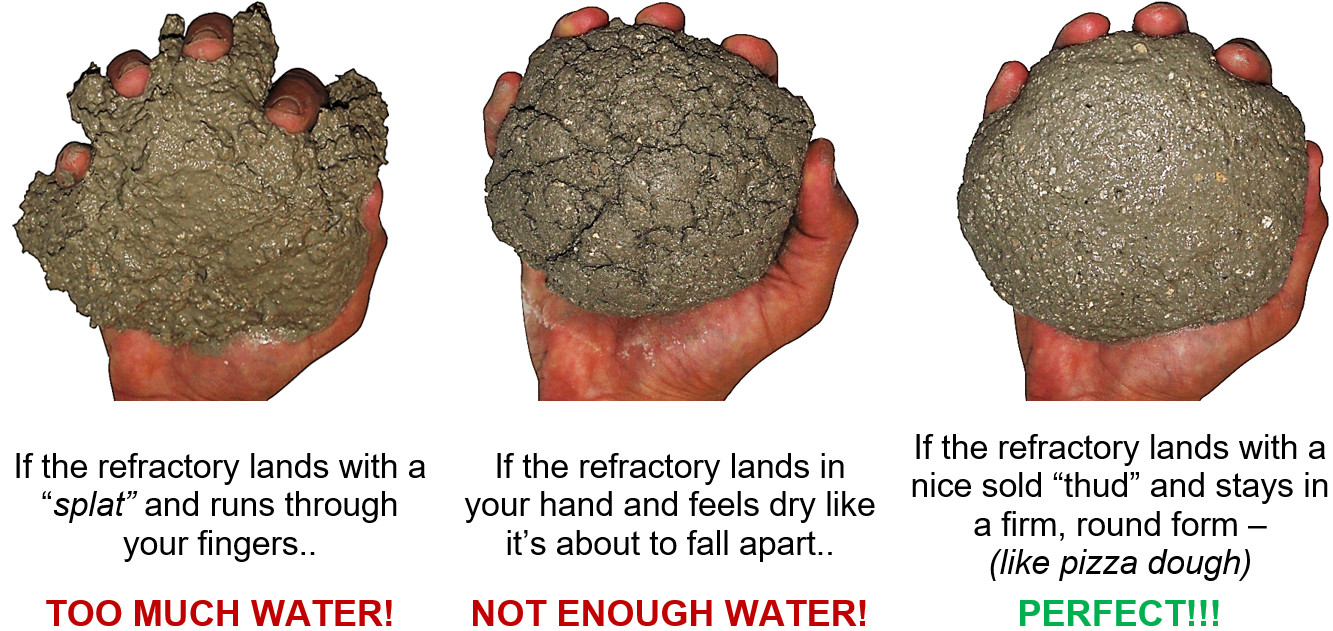 When you make / mix Castable Refractory with water, you are using a VERY LITTLE bit of ICE COLD WATER (the colder the better - it slows the curing process). You’re going to add just enough water to get the Castable Refractory to the texture of cookie dough… or pizza dough… or Playdoh.